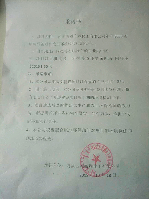 内蒙古雅布赖化工有限公司年产8000吨甲硫醇钠项目竣工环境验收检测报告的公示