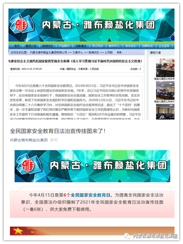 为了让公司员工深入了解国家安全相关知识,增强国家安全意识,自觉履行维护国家安全、保守国家秘密的义务,在第六个全民国家安全教育日来临之际,4月15日,雅盐化集团公司在职工文化广场开展了以“践行总体国家安全观,统筹发展和安全,统筹传统安全和非传统安全,营造庆祝建党100周年良好氛围”为主题的国家安全宣传教育活动。
